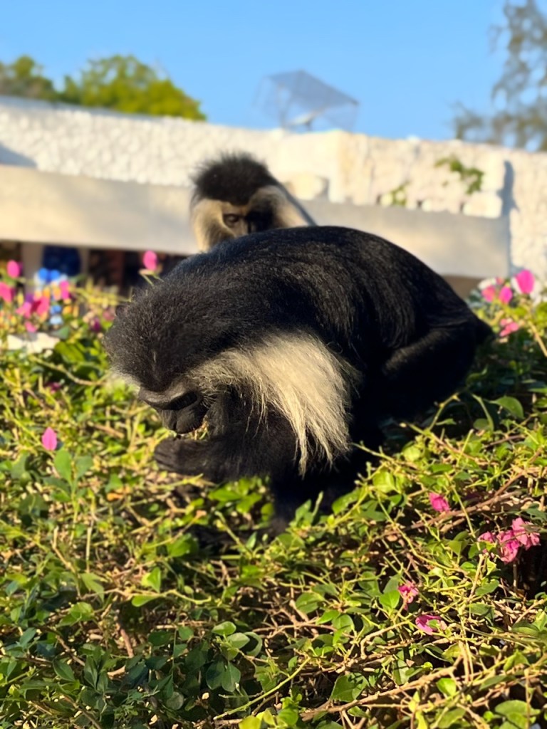 The second kind of ape is the Colobus monkey. These rarely descend to the ground in groups of 8 up to 15 individuals. As suggested by their name, adult colobi have black fur with white features. White fur surrounds their facial region and a „U“ shape of long white fur runs along the sides of their body. Newborn colobi are completely white with a pink face. At our hotel the colobi are often seen in late afternoon sitting on bushes and eat leafs.